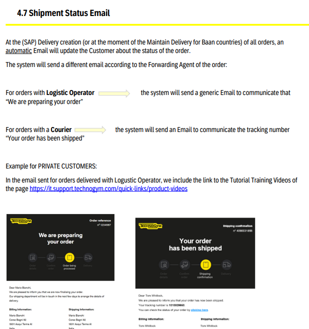 - Shipment status e-mail: automatische statusupdate vanuit SAP; afhankelijk van verzendtype met tracking of algemene update, soms aangevuld met tutorial video’s.