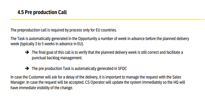 - Pre-production call (EU): 3–5 weken voor de geplande leverweek wordt gecheckt of planning nog klopt en worden eventuele wijzigingen afgestemd.